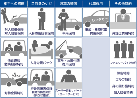 取り扱い保険:自動車保険、火災保険、傷害保険、旅行傷害保険、ゴルフ保険、生命保険